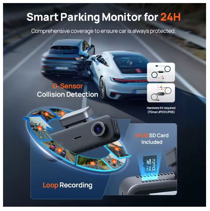 24-Hour Parking Monitor: Stay protected with 24-hour parking surveillance, guarding your vehicle even when parked.