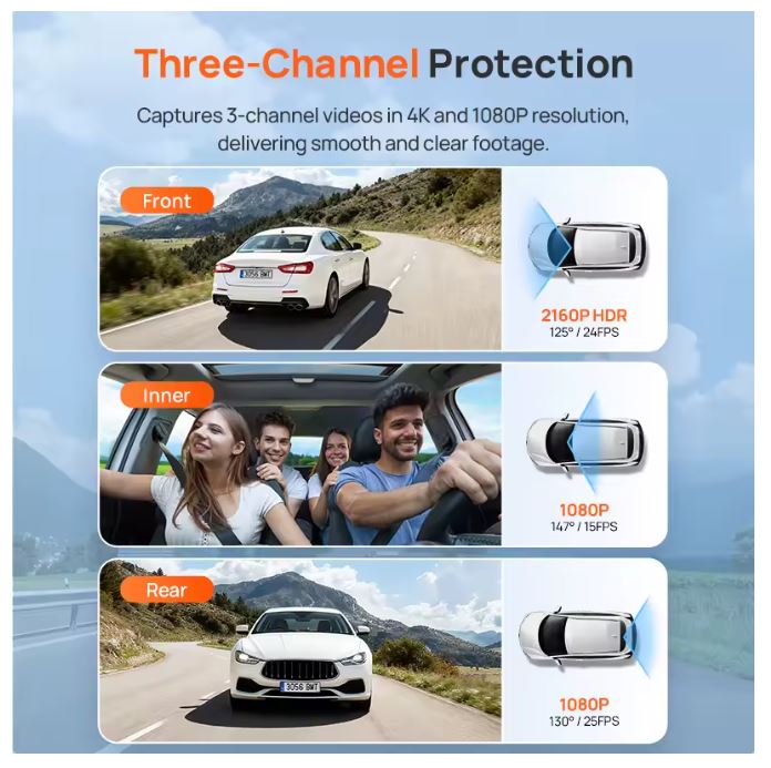 3-Channel Recording: Record from front, rear, and interior with a 3-channel setup for comprehensive coverage.