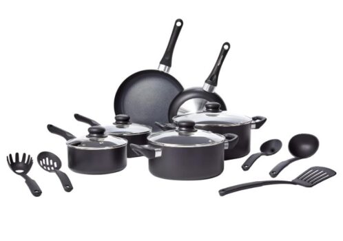 - 15-piece cookware set includes 8-inch fry pan, 10-inch fry pan, 1.5-quart saucepan with lid, 2-quart saucepan with lid, 3-quart casserole pan with lid, 5-quart casserole pan with lid, and 5-piece utensil set with pasta server, soup ladle, slotted turner, serving spoon, and slotted serving spoon