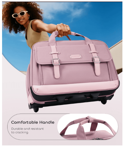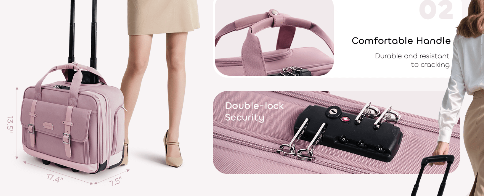 • 【Travel Friendly & Double-compartment Locking】This rolling briefcase for women is designed with TSA-friendly locks on both the main compartment and computer compartment, which greatly enhances privacy and security. The size of this rolling laptop bag meets the requirements of most airlines and can be placed in the overhead bin or under the seat. Make traveling more convenient and easy! Perfect for those who often need to travel for business or short trips