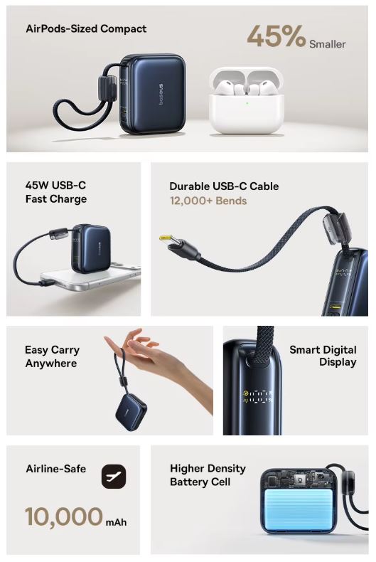 Compact Design:At a pocket-sized 72x61x27mm, this baseus mini power bank is 45% smaller, making it ideal for on-the-go power needs.