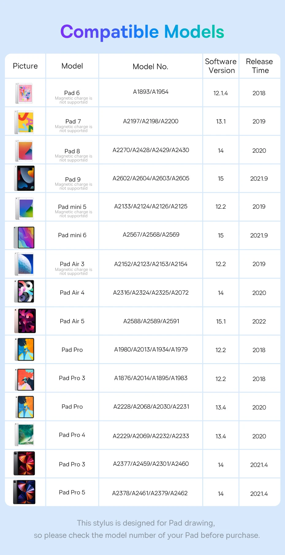 עט סטילוס לאייפדים של אפל – רשימת דגמים תומכים