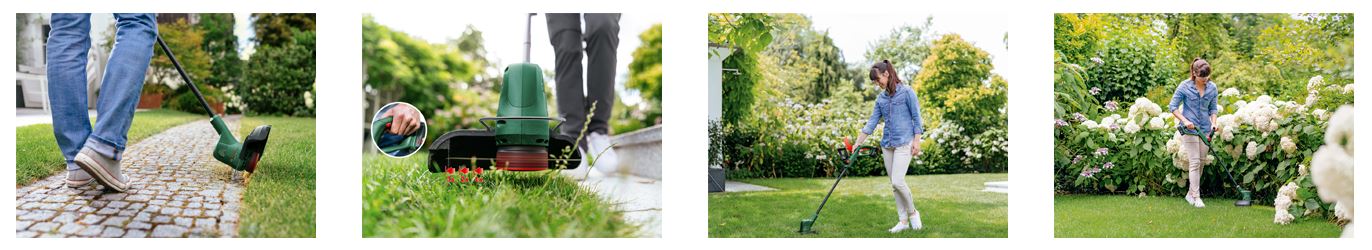 - Continuous cutting: uninterrupted cutting with the Bosch battery trimmer by tracking the thread every time the switch is released