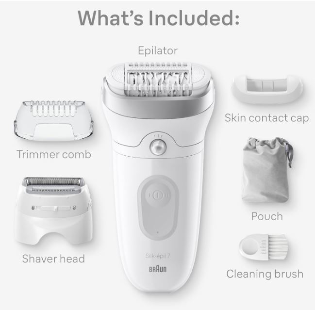 - INCLUDES: SE7 Epilator, Shaver Head, Trimmer comb, Skin Contact Cap, Cleaning Brush, and Pouch