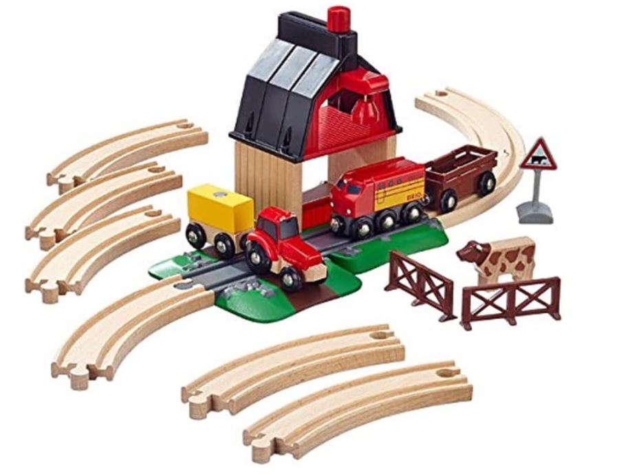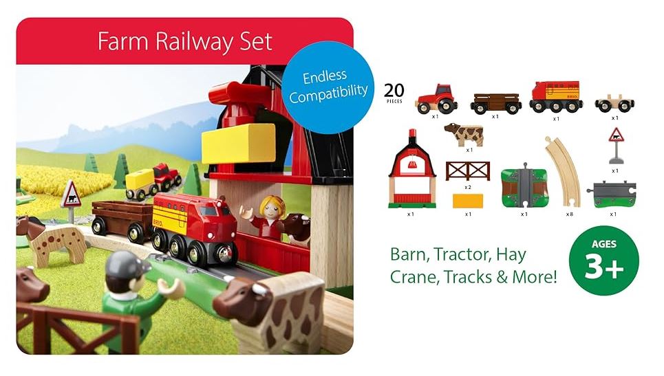 - Timeless Keepsake: Create lasting memories with your child using the exciting Farm Railway Set, compatible with all BRIO wooden train toys. This dynamic farm with a hay barn, crane, cow, tractor & more promises a lifetime of railway farm adventures.