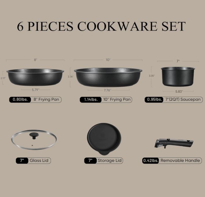 • Set Includes: 8″ fry pan, 10″ fry pan, 2-qt saucepan with lid, 7″ fridge storage lid, 1*removable handle.