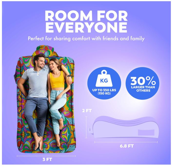 - Fun Bold Prints to Stand Out – Choose from vibrant, unique patterns that make your air lounger the life of the party—ideal for festivals, camping, or a day at the beach. Enjoy comfort and style wherever you go.