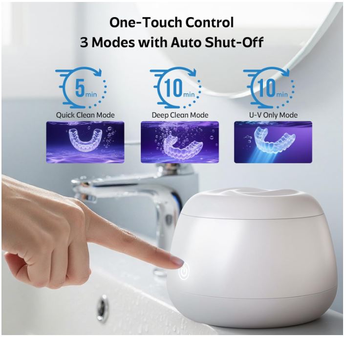 - 【Three Smart Modes with One-Button Operation】5-Min Quick Clean (Ultrasonic + UV), 10-Min Deep Clean (Ultrasonic + UV), or 10-Min UV Only—all with automatic shutoff. Whether cleaning a night guard or aligner tray, this system ensures simple, effective use.
