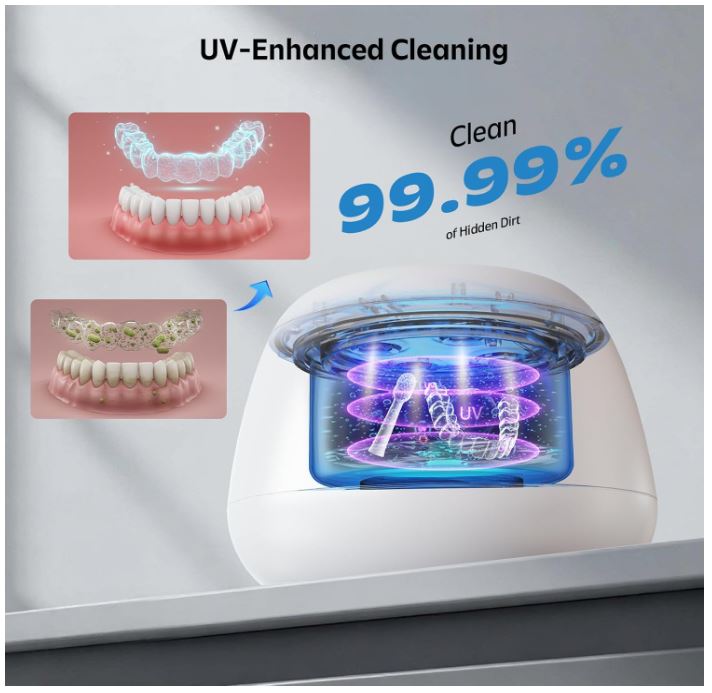 - 【U-V Enhanced Deep Cleaning】Built-in 4 U-V lights under the lid provide extra sanitation by reaching hidden residue. Perfect for daily cleaning of items like trays, guards, and aligners.