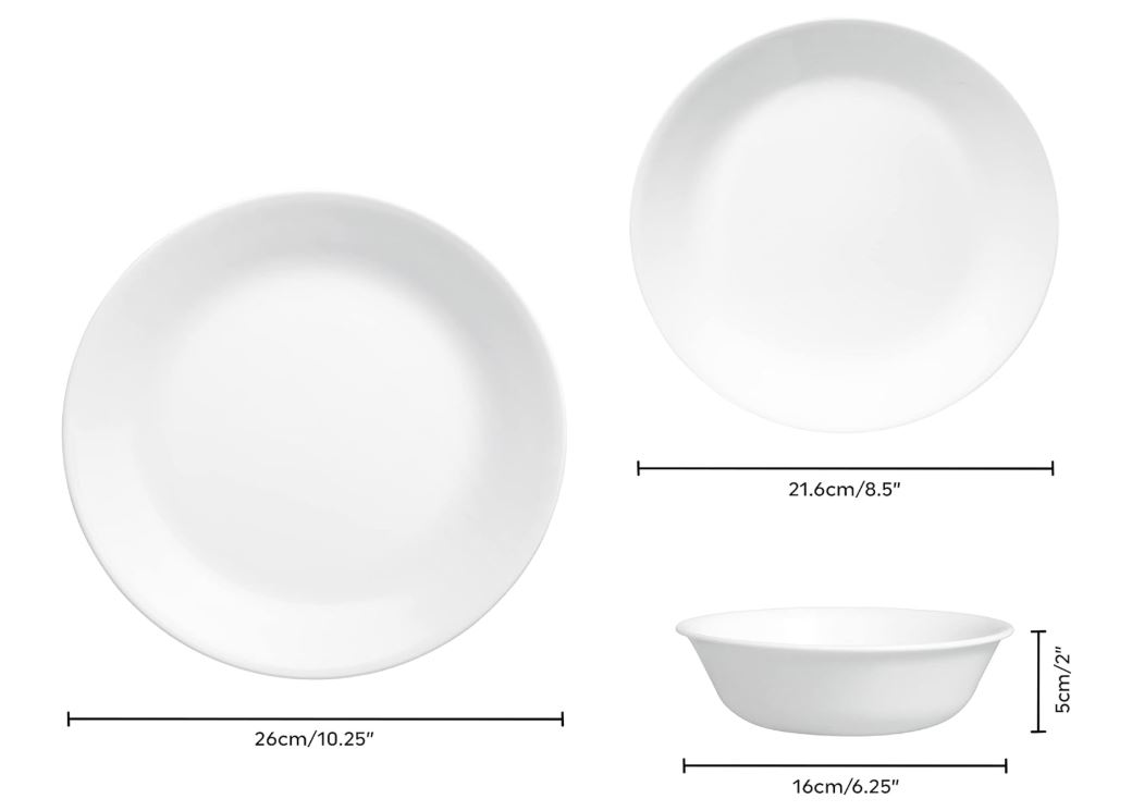 Made of up to 80% pre-consumer recycled glass, Corelle is the sustainable choice that is so natural and so strong, you’ll never need to replace them. And our zero waste manufacturing methods mean that every offcut goes straight back into production, making them an eco-friendly dinnerware option. With place settings for four people, these 12pc sets include: 4 x dinner plates (26cm), 4 x side plates (21.6cm) and 4 x soup/cereal bowls in a range of modern designs, suitable for every kitchen. Upgrade your tableware, once and for all.