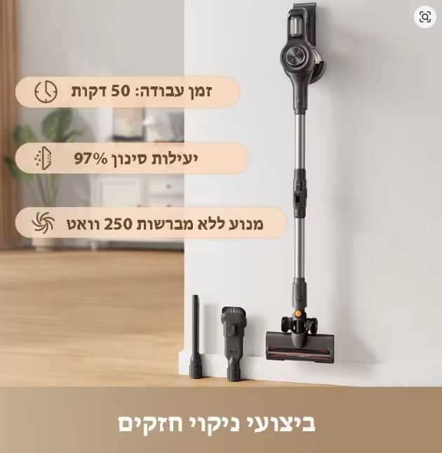 - זמן עבודה ארוך: סוללה בקיבולת גבוהה מספקת עד 50 דקות של עבודה רציפה בטעינה אחת, מה שמאפשר לנקות שטח נרחב ללא צורך בהטענות חוזרות ונשנות.