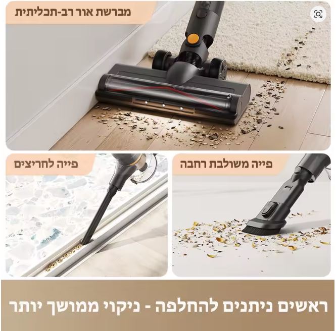 - תאורת LED: מברשת השואב מצוידת בתאורת LED מובנית, המאירה אזורים חשוכים ומאפשרת לראות לכלוך ואבק שעלולים להיעלם מהעין.