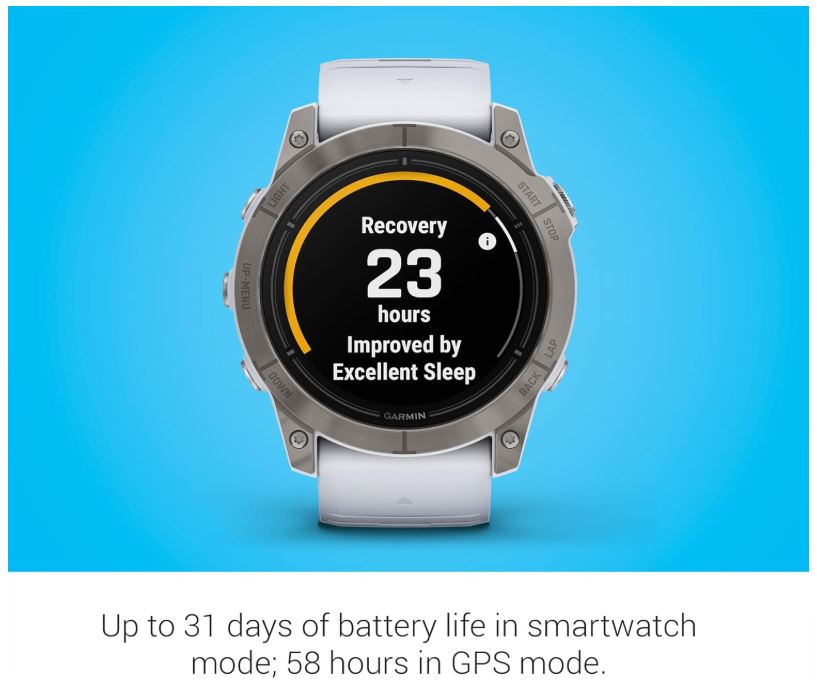 All day, every day — the epix™ Pro – Sapphire Edition smartwatch helps you conquer every hour. Designed for larger wrists, this ultimate high-performance smartwatch features a stunning AMOLED display. Go longer between charges with up to weeks of battery life in smartwatch mode. Rise to any challenge with advanced training features; hill score measures your climbing performance over time, and real-time stamina updates gauge your stamina potential.