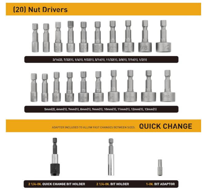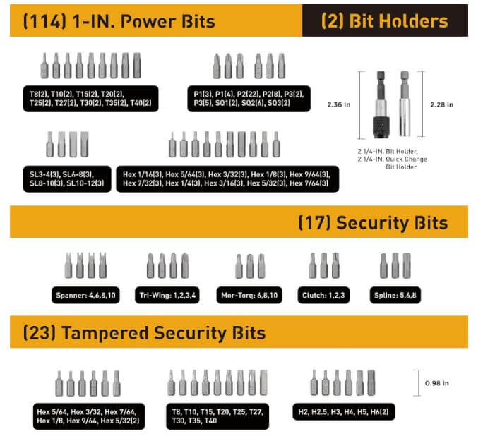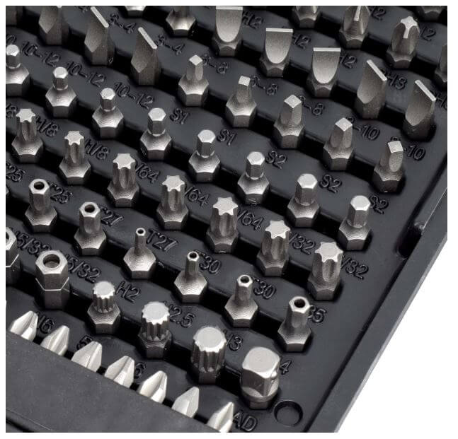 - Including hard-to-find sizes and driver configurations, this bit set contains every tool necessary to tighten and loosen every fastener in and around the home.