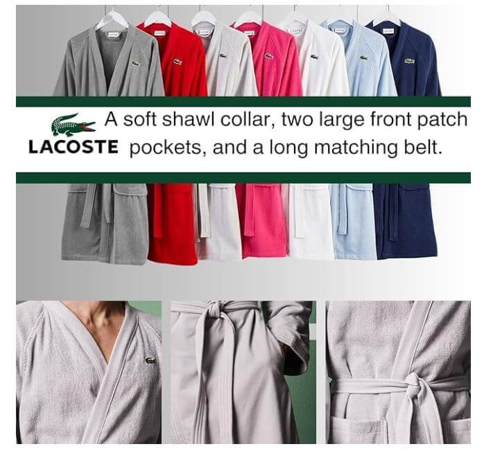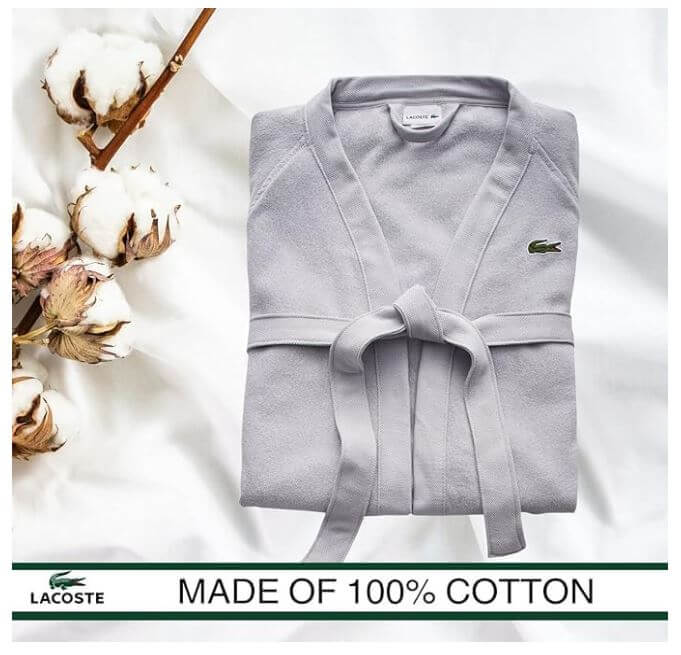 - PREMIUM COTTON CRAFTSMANSHIP – Wrap yourself in the comfort of a Lacoste Classic Pique Bath Robe. Made from a soft cotton terry, this comfortable robe is available in a large palette of signature Lacoste colors.