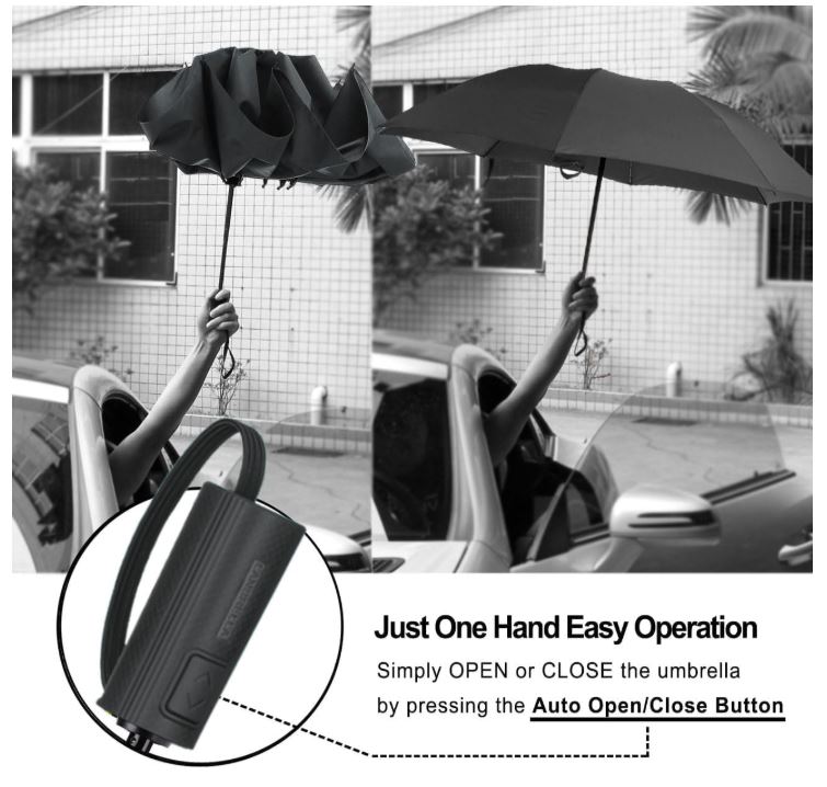 - CONVENIENT AUTO OPEN/CLOSE IN ONE SECOND: Just push the button once to automatically open and press again to instantly fold the canopy closed. You do not need to wait another second to open the umbrella when you get out of your car in the rain, especially in heavy rainfall, even when your hands are full of things.