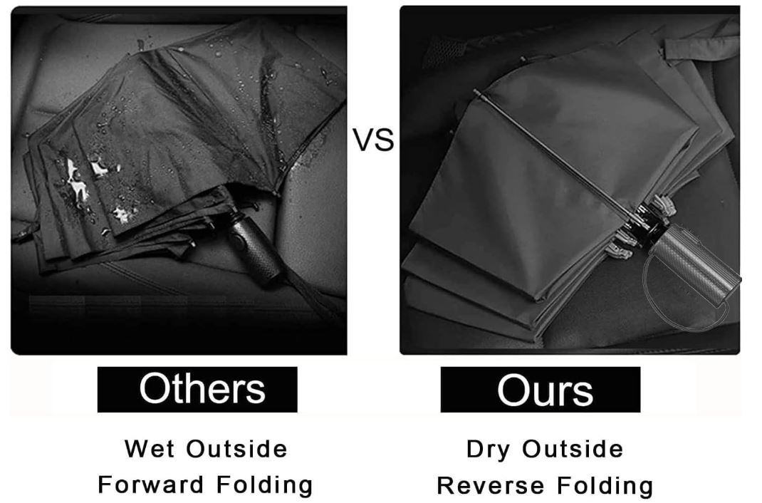 - UNIQUE INVERTED FOLDING DESIGH: This upside down umbrella takes a inside-out design. When close it, the wet part will be inside of the umbrella, preventing water from dripping,and it will not get yourself wet when getting in and out of the car. You don’t even need to worry about this automatic travel umbrella will wet your floor and mat.