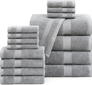 • Each 16-Piece Platinum Towel Set includes : 4 Extra Large Bath Towels – 28″ x 54″ , 4 Hand Towels – 16″ x 28″ and 8 Wash Cloths – 13″ x 13″. Crafted from premium Cotton, each bath towel, hand towel, and wash towel promises to be soft on your skin to keep you warm and dry after you step out of the shower.