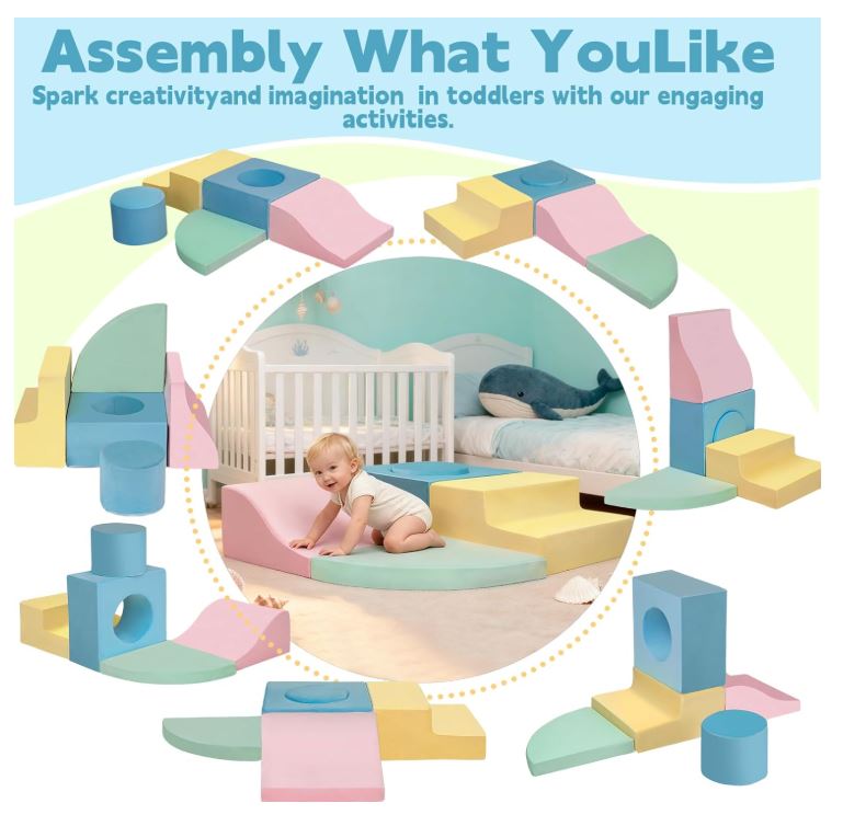 • Advantages: Our toddler climbing toys indoor adds fun to families with multiple children. The 2-in-1 square soft blocks can be disassembled into a crawling tunnel or assembled into a climbing play structure