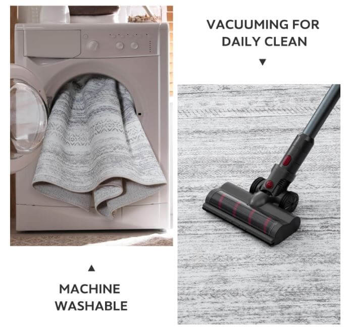 - Easy to Maintain: To care for this washable rug, vacuum it without a beater bar regularly and spot-clean it as needed. You can also put the rug into the washing machine with cold water and dry without heat.