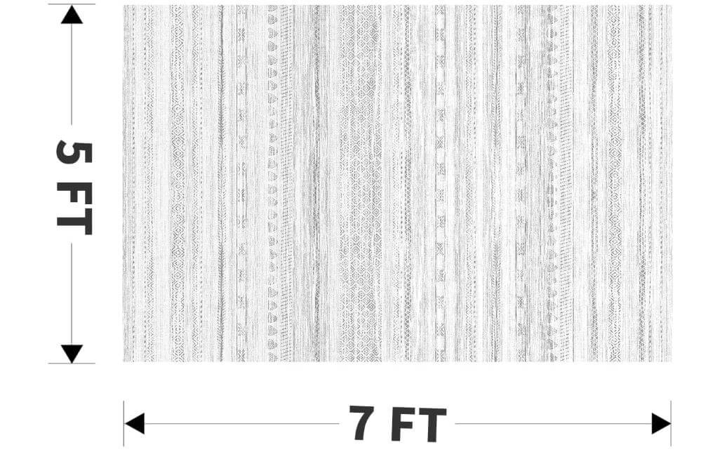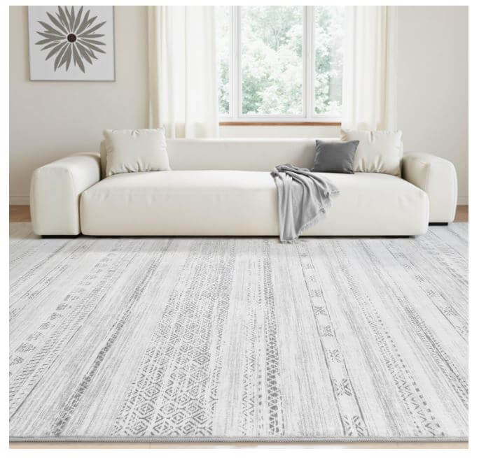- Decorative Living Room Rugs: This area rug grounds your indoor space in a bohemian-inspired print. It features rows of various geometric patterns in cream and grey hues, and it’s purposefully distressed for a vintage feel.