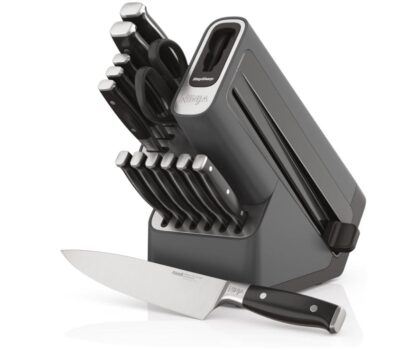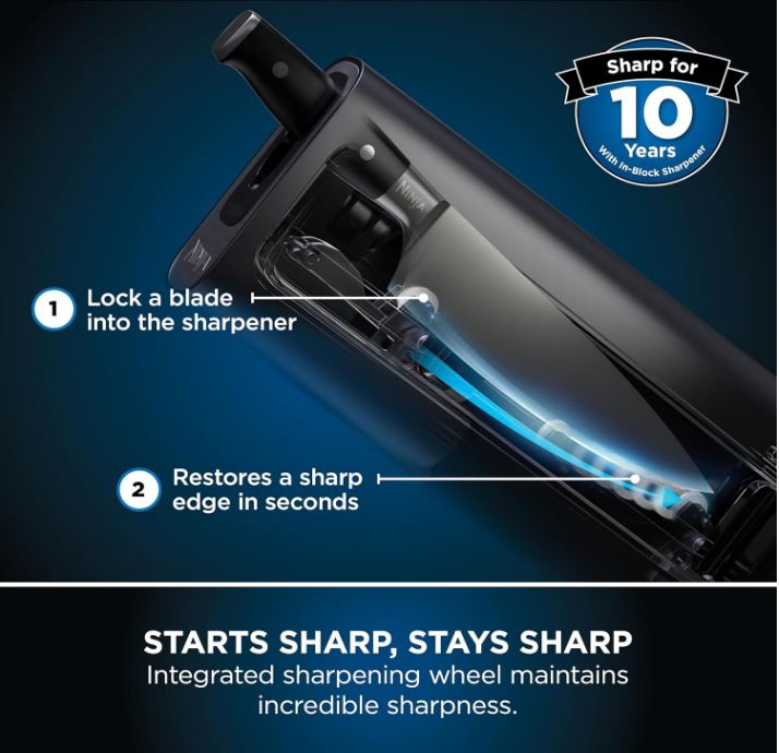 • STARTS SHARP, STAYS SHARP: Maintain incredible sharpness at home with an integrated StaySharp knife sharpener conveniently built into the storage knife block. Simply lock a blade into the sharpener to restore the blade’s sharp edge with a few swipes of the lever.