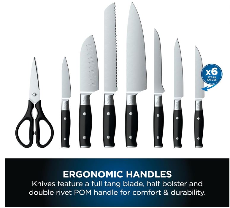 • DURABLE STAINLESS STEEL: Built to last from forged German stainless steel with durable double-rivet construction, Ninja knives are rust resistant and strong enough for all your kitchen cutting tasks.