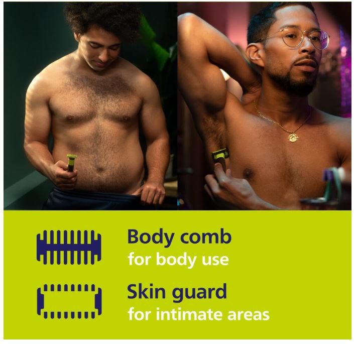 - Take care of body hair: trim and shave body hair in any direction with the click-on body comb (3 mm) and use the skin guard for an extra layer of protection on sensitive areas