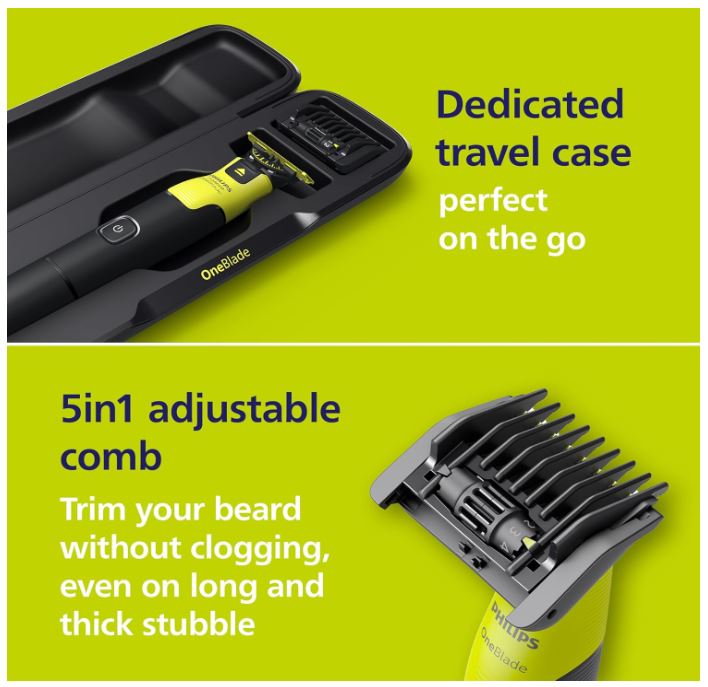 - The set includes: 1x Philips Norelco OneBlade 360 with Connectivity, 1x 360 Blade for face, 1x 5-in-1 adjustable comb (1-5mm), 1x body kit (1x skin guard, 1x body kit, 1x extra body blade), 1x travel case, 1x USB-A cable