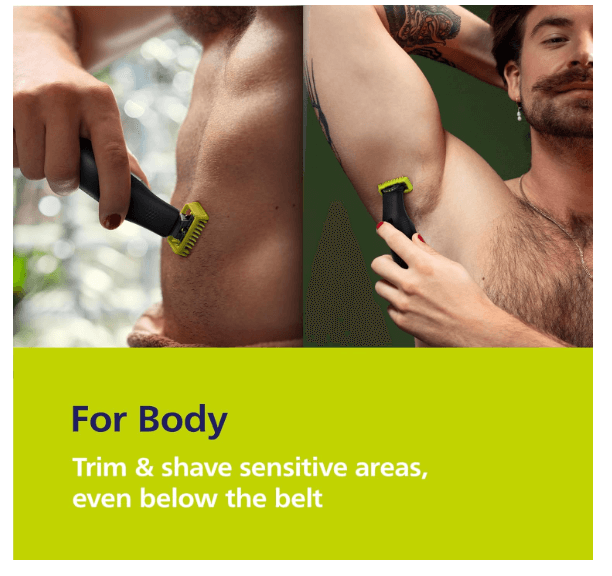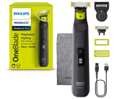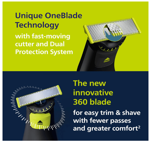The Philips Norelco OneBlade Pro 360 Face + Body is a revolutionary new hybrid styler that can trim, shave and create clean lines and edges, on any length of hair. Forget about using multiple steps and tools. OneBlade does it all. Its shaving technology features a fast-moving cutter that moves up to 12000x per minute, which powers through any length of hair.
