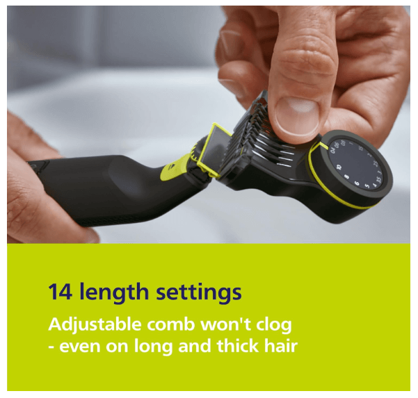 • More length settings for personalized trim: get an even stubble length with a 14-length comb (0.4-10mm), create precise edges with the dual-sided blade and shave off any length of hair easily