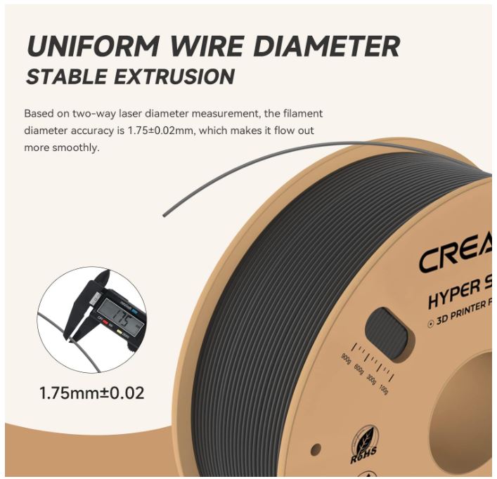 Dimensional Accuracy & ConsistencyOfficial Creality Hyper PLA Filament 1.75mm Uniform Wire Diameter, Stable Extrusion.Based on two-way laser diameter measurement, the filament diameter accuracy is 1.75±0.02mm, which makes it flow out more smoothly.