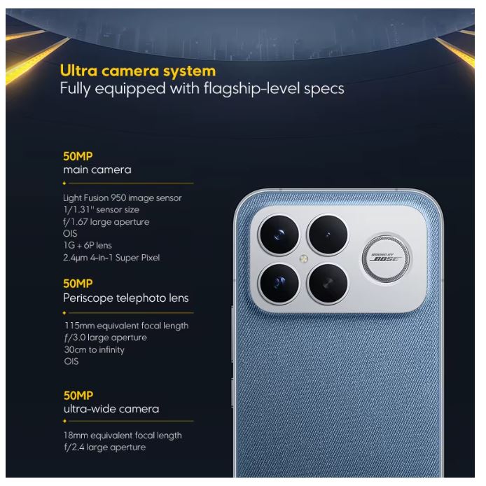 Camera ——50MP Main Camera With OlS+50MP Periscope Telephoto Camera+50MP Ultra-Wide-Angle, 32MP Front Camera