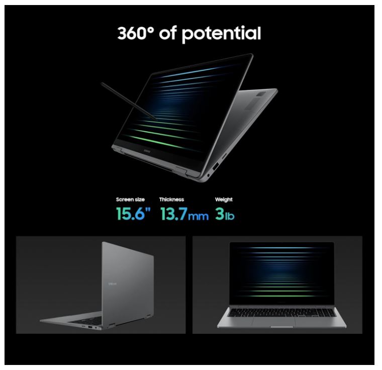 - POWERFUL. DURABLE. LIGHT. AMAZINGLY SLIM: Galaxy Book5 360 is the epitome of portability and the lightest in our all-new Galaxy Book5 Series but very durable carved from CNC Aluminum; Thickness: 13.7mm, Weight: 3.22 lbs.