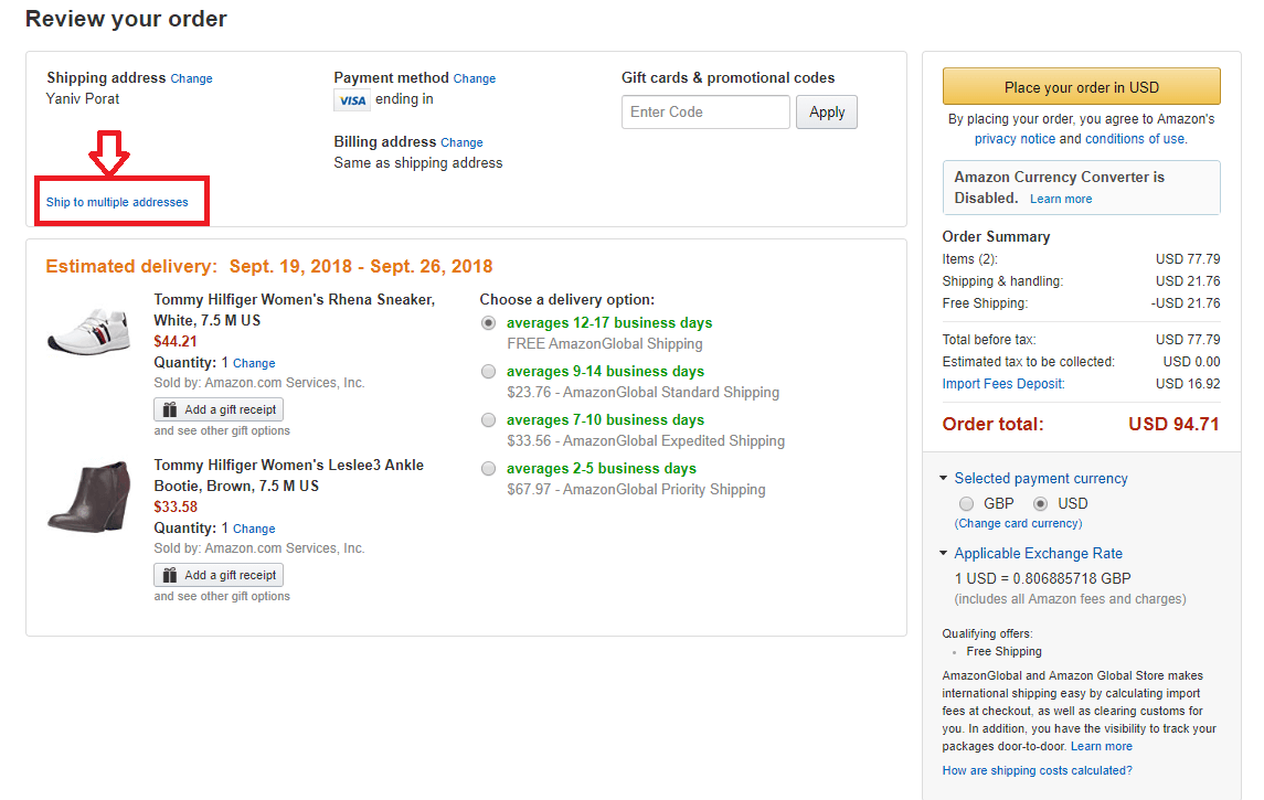 בשלב זה מתחת לכתובת למשלוח תופיע האפשרות “ship to multiple addresses”