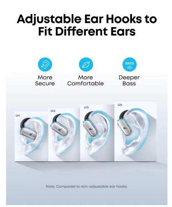 A Perfect Fit for Every Ear: soundcore’s innovative 4-level adjustable ear hooks ensure a comfortable fit tailored to over 99% of ear shapes and sizes.