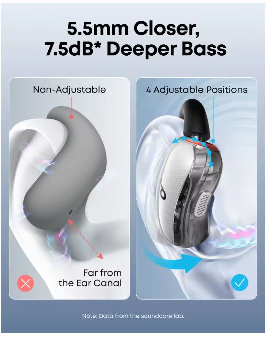 Close to the Ear Canal for Deeper Bass: Adjustable ear hooks bring the sound closer, delivering the bass you crave. With a maximum boost of 7.5dB over non-adjustable hooks, enjoy richer, more powerful beats. Note: Data from the soundcore lab.