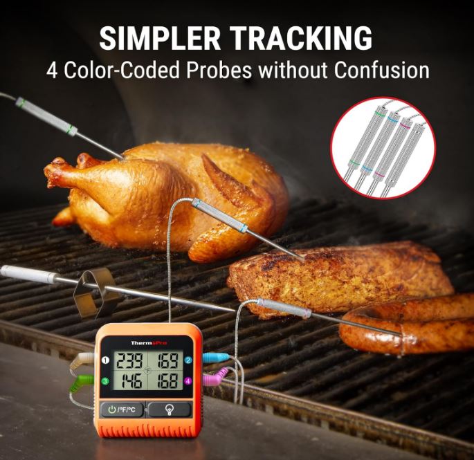 - 4 Color-Coded Probes for Simple Tracking: Monitor up to 4 different meats or temperatures at once with easy-to-identify, color-coded probes. No confusion, just straightforward, organized cooking, making this a wireless grill thermometer that empowers you to cook smarter, not harder