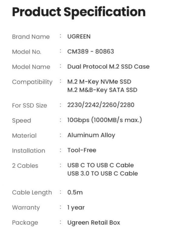 > > This M-Key SSD Case is only compatible with M-Key(NVMe Protocol) / M&B-Key (both NVME and SATA Protocol) SSD, but does NOT compatible with B-Key(SATA Protocol) SSD. > > This product is only case for hard drive,SSD is NOT included.