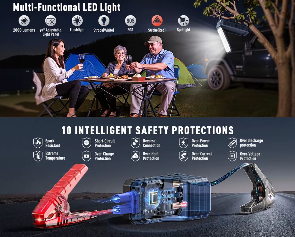 Feature 5 Multifunctional Jump Starter with Tire Inflator and Camping Light