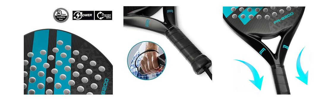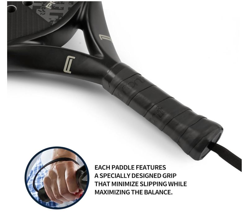 Each padel racket features a specially designed grip that minimize slipping while maximizing the balance. Handle circumference at 4.3 inches allows for wrist action, spin, power and quick hand changes flawlessly.